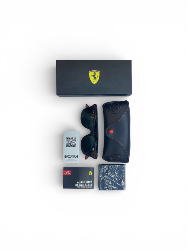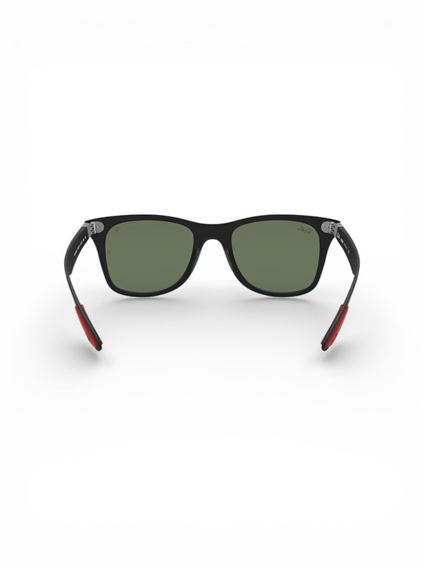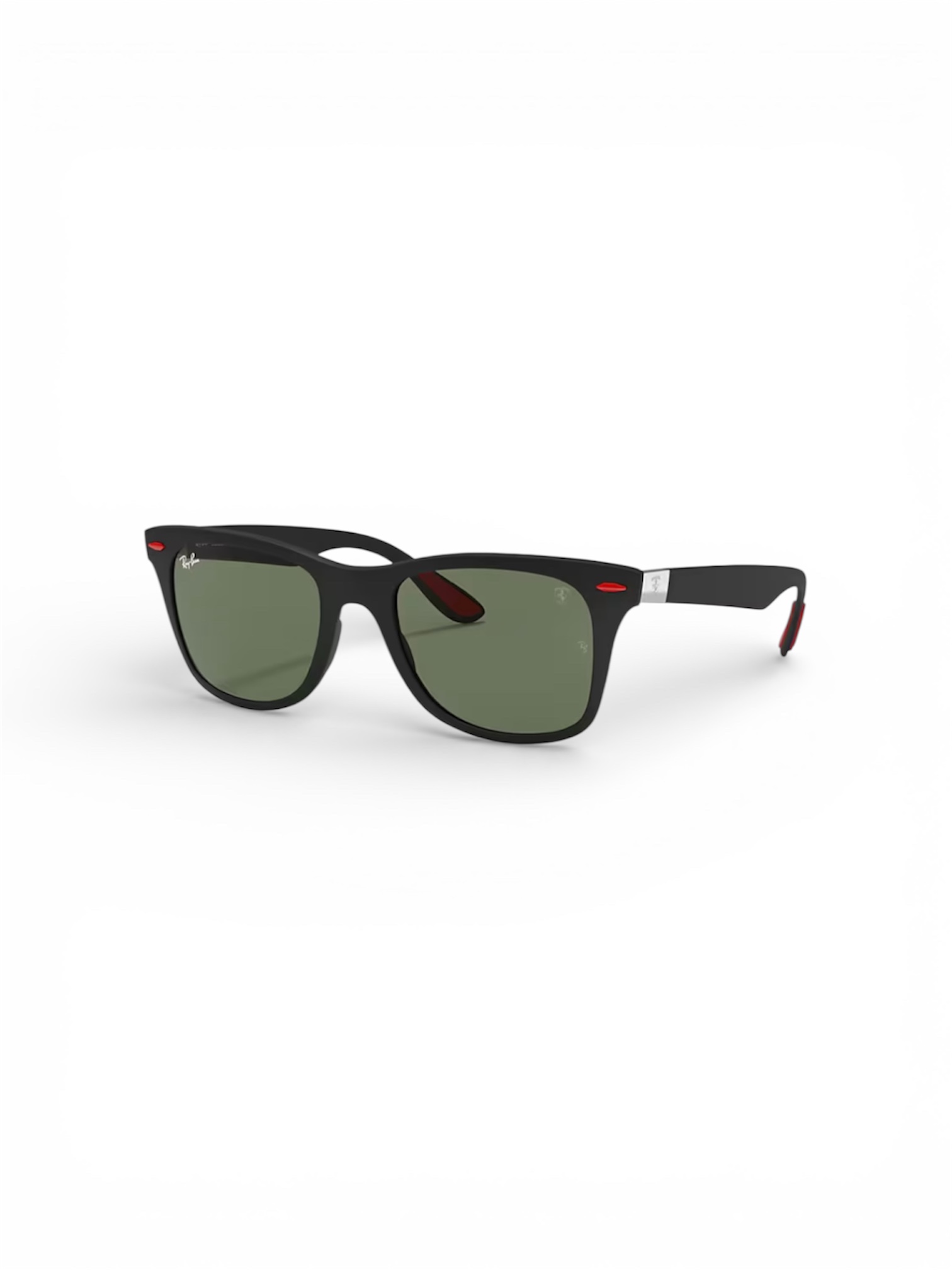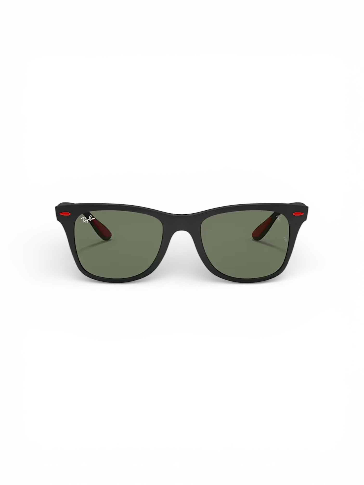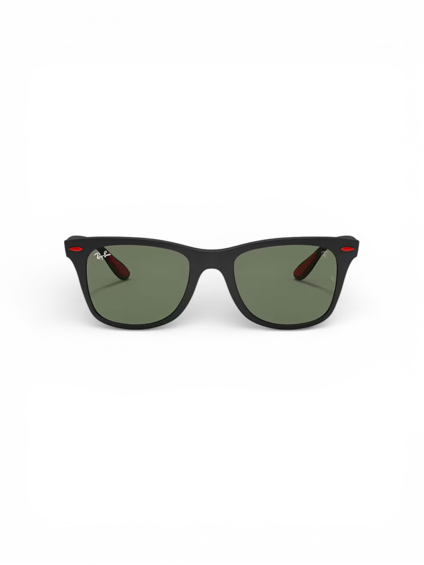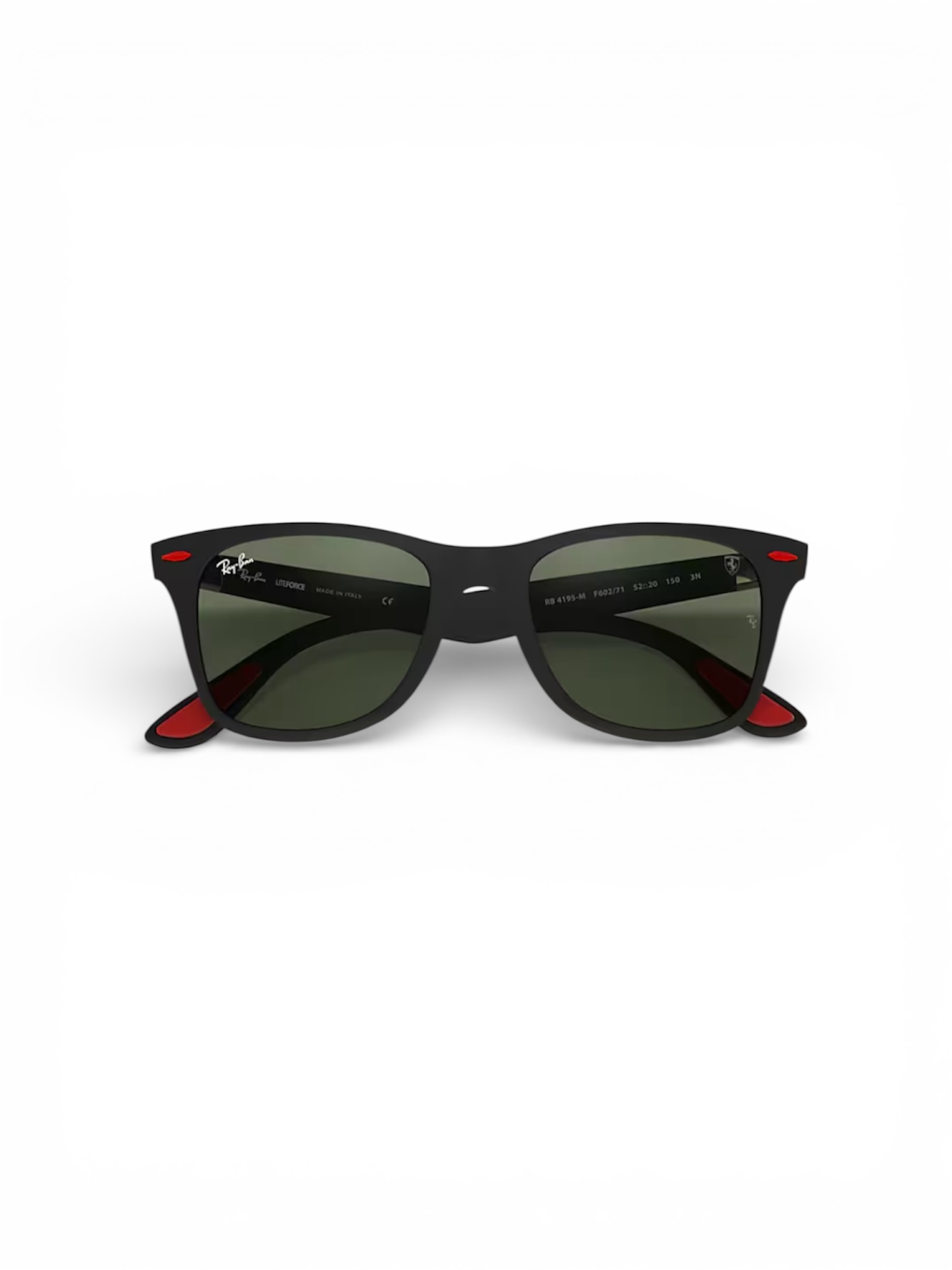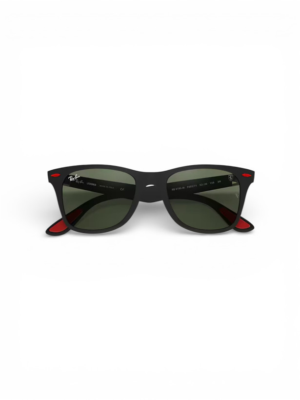 عینک آفتابی Ray‑Ban RB4195M از مجموعه Scuderia Ferrari با فریم سبک و مقاوم Liteforce و طراحی کلاسیک Wayfarer با جزئیات برند Ferrari شامل آیکون Shield روی لنز و تزئینات قرمز روی دستهها باز طراحی شده.